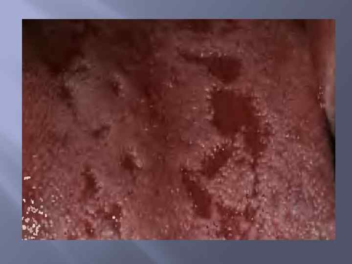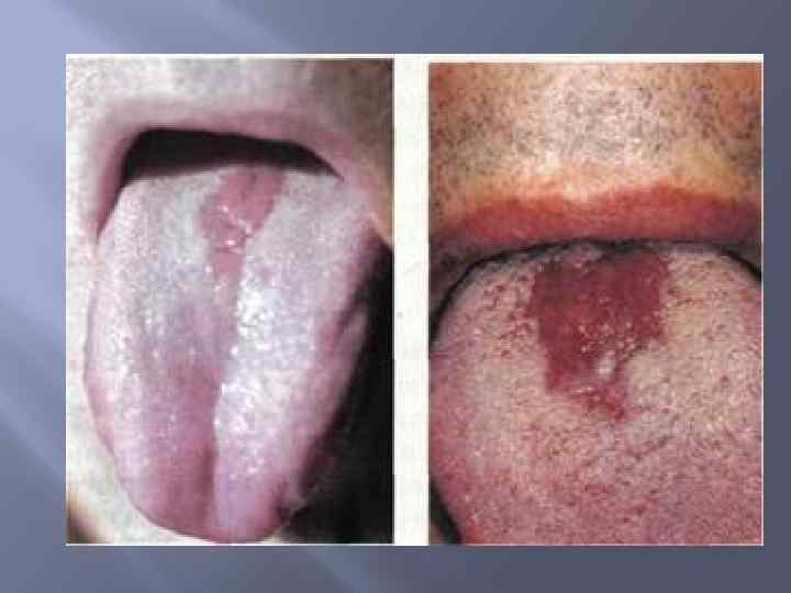 Формы глоссита: 1. Десквамативный глоссит (географический язык). 2. Срединный ромбовидный глоссит.