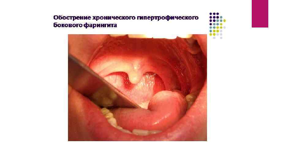 Хронический гипертрофический фарингит бывает гранулезный(на задней стенке глотки видны увеличенные и воспаленные лимфоидные фолликулы в виде красных) и боковой ( гипертрофированная аденоидная ткань, заложенная в боковых складках глотки, расположенная за задними небными дужками.