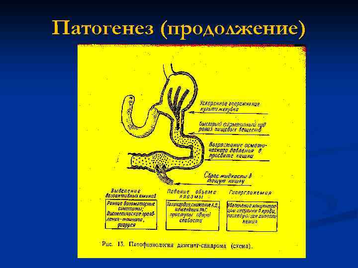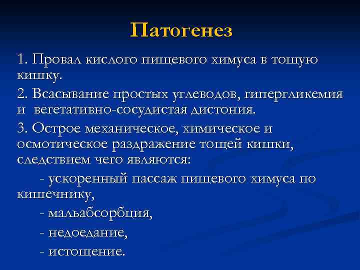 Патогенез 1. Провал кислого пищевого химуса в тощую кишку. 2. Всасывание простых углеводов, гипергликемия и вегетативно-сосудистая дистония. 3. Острое механическое, химическое и осмотическое раздражение тощей кишки, следствием чего являются: - ускоренный пассаж пищевого химуса по кишечнику, - мальабсорбция, - недоедание, - истощение.