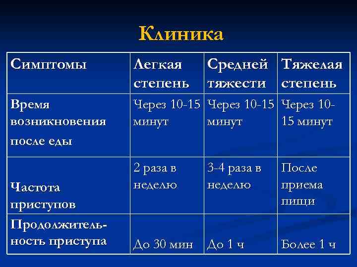 Клиника Симптомы Легкая степень Время возникновения после еды Через 10 -15 Через 10 минут 15 минут Частота приступов Продолжительность приступа Средней Тяжелая тяжести степень 2 раза в неделю 3 -4 раза в неделю После приема пищи До 30 мин До 1 ч Более 1 ч