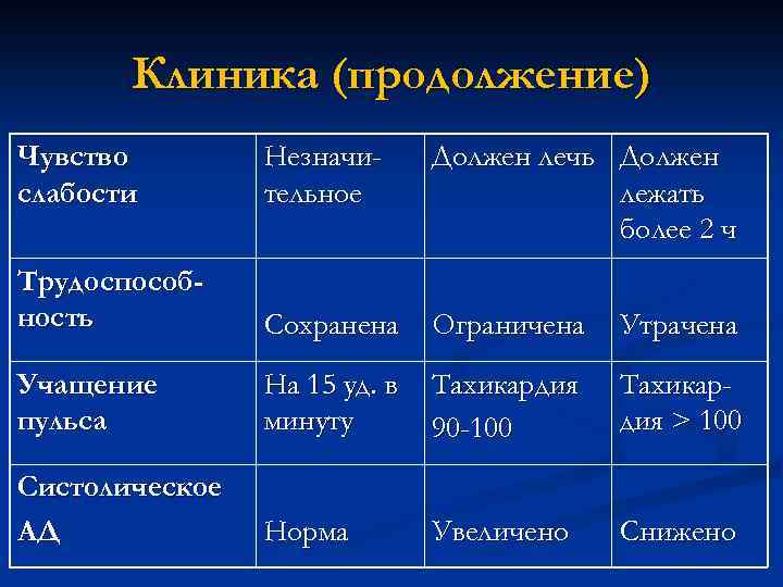 Клиника (продолжение) Чувство слабости Незначительное Должен лечь Должен лежать более 2 ч Трудоспособность Сохранена Ограничена Утрачена Учащение пульса На 15 уд. в минуту Тахикардия 90 -100 Тахикардия > 100 Систолическое АД Норма Увеличено Снижено