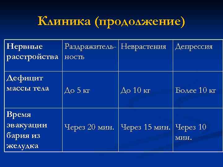 Клиника (продолжение) Нервные Раздражитель- Неврастения Депрессия расстройства ность Дефицит массы тела Время эвакуации бария из желудка До 5 кг До 10 кг Более 10 кг Через 20 мин. Через 15 мин. Через 10 мин.