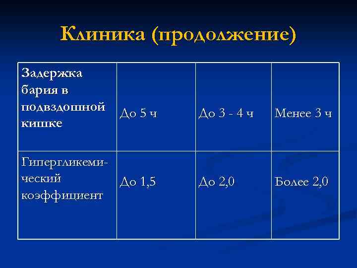 Клиника (продолжение) Задержка бария в подвздошной кишке До 5 ч Гипергликемический До 1, 5 коэффициент До 3 - 4 ч Менее 3 ч До 2, 0 Более 2, 0