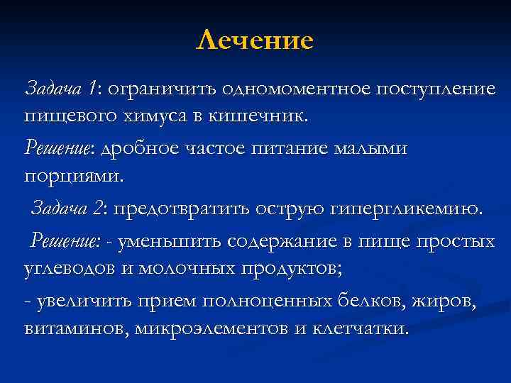 Лечение Задача 1: ограничить одномоментное поступление пищевого химуса в кишечник. Решение: дробное частое питание малыми порциями. Задача 2: предотвратить острую гипергликемию. Решение: - уменьшить содержание в пище простых углеводов и молочных продуктов; - увеличить прием полноценных белков, жиров, витаминов, микроэлементов и клетчатки.