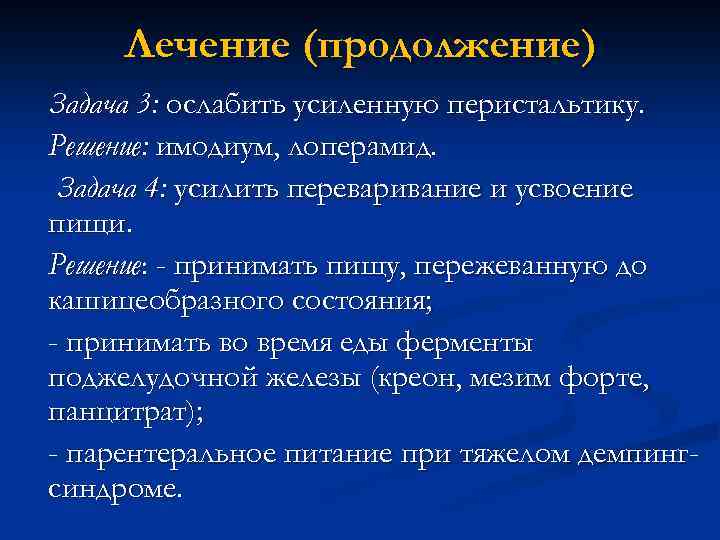 Лечение (продолжение) Задача 3: ослабить усиленную перистальтику. Решение: имодиум, лоперамид. Задача 4: усилить переваривание и усвоение пищи. Решение: - принимать пищу, пережеванную до кашицеобразного состояния; - принимать во время еды ферменты поджелудочной железы (креон, мезим форте, панцитрат); - парентеральное питание при тяжелом демпингсиндроме.