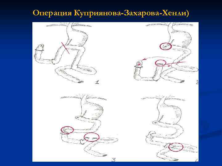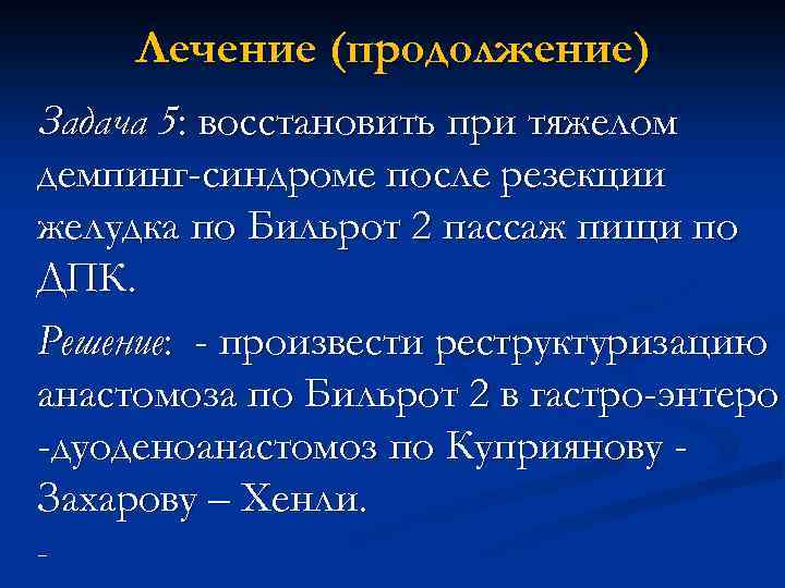 Лечение (продолжение) Задача 5: восстановить при тяжелом демпинг-синдроме после резекции желудка по Бильрот 2 пассаж пищи по ДПК. Решение: - произвести реструктуризацию анастомоза по Бильрот 2 в гастро-энтеро -дуоденоанастомоз по Куприянову Захарову – Хенли. -