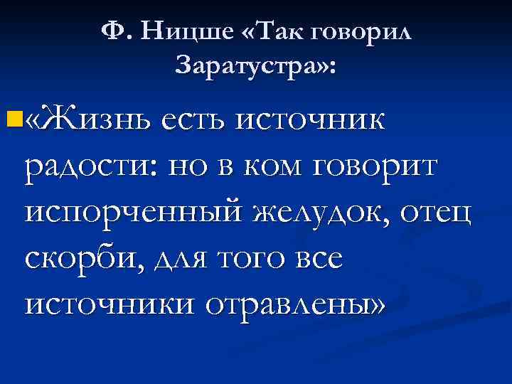 Ф. Ницше «Так говорил Заратустра» : n «Жизнь есть источник радости: но в ком говорит испорченный желудок, отец скорби, для того все источники отравлены»