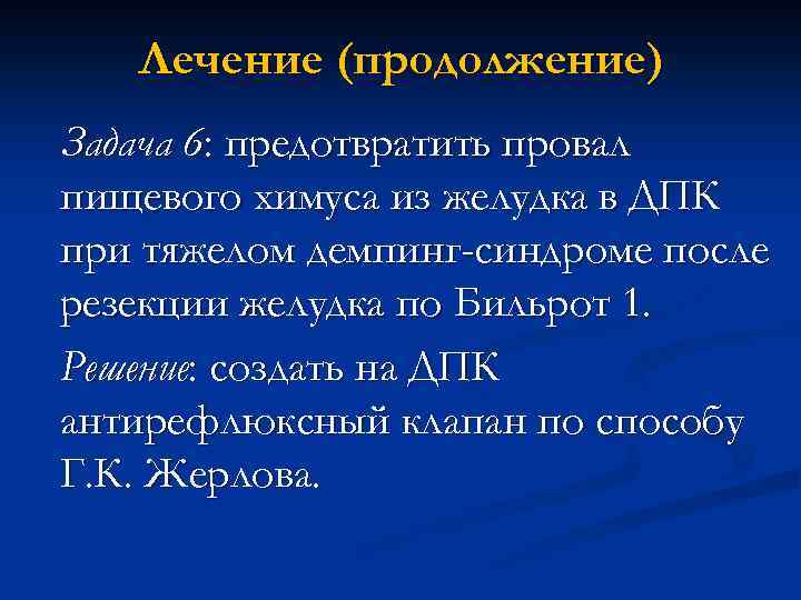 Лечение (продолжение) Задача 6: предотвратить провал пищевого химуса из желудка в ДПК при тяжелом демпинг-синдроме после резекции желудка по Бильрот 1. Решение: создать на ДПК антирефлюксный клапан по способу Г. К. Жерлова.