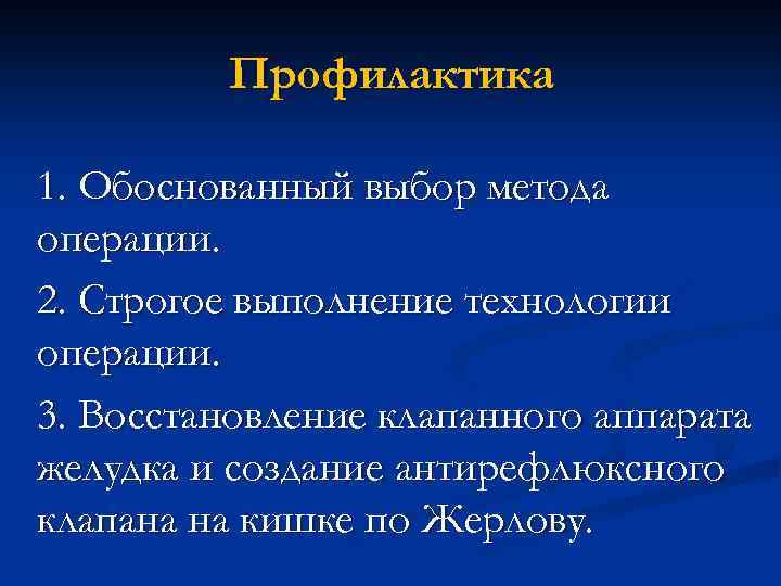Профилактика 1. Обоснованный выбор метода операции. 2. Строгое выполнение технологии операции. 3. Восстановление клапанного аппарата желудка и создание антирефлюксного клапана на кишке по Жерлову.