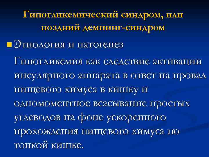 Гипогликемический синдром, или поздний демпинг-синдром n Этиология и патогенез Гипогликемия как следствие активации инсулярного аппарата в ответ на провал пищевого химуса в кишку и одномоментное всасывание простых углеводов на фоне ускоренного прохождения пищевого химуса по тонкой кишке.