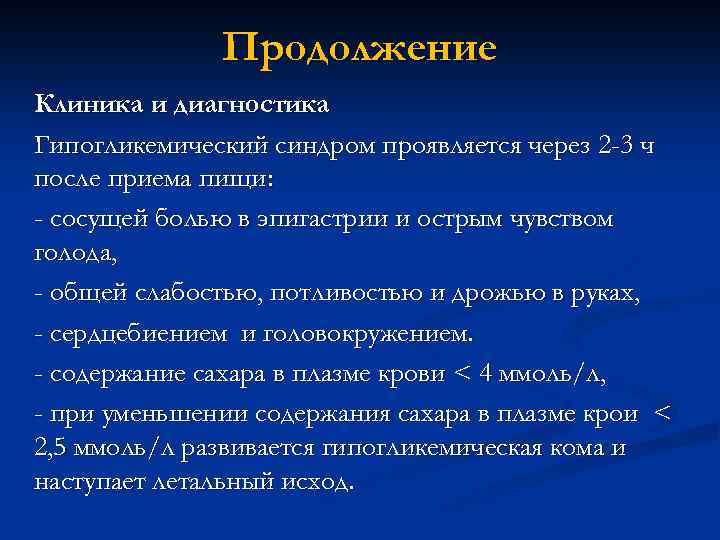 Продолжение Клиника и диагностика Гипогликемический синдром проявляется через 2 -3 ч после приема пищи: - сосущей болью в эпигастрии и острым чувством голода, - общей слабостью, потливостью и дрожью в руках, - сердцебиением и головокружением. - содержание сахара в плазме крови < 4 ммоль/л, - при уменьшении содержания сахара в плазме крои < 2, 5 ммоль/л развивается гипогликемическая кома и наступает летальный исход.