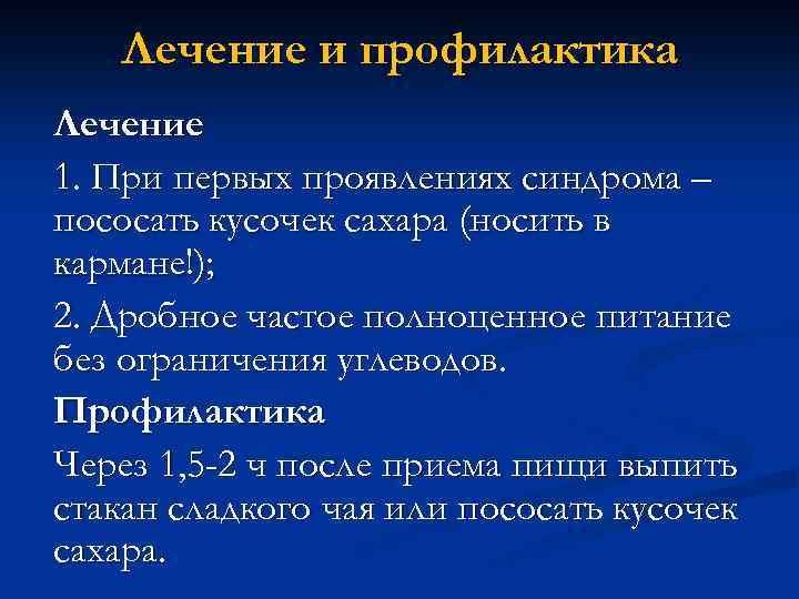 Лечение и профилактика Лечение 1. При первых проявлениях синдрома – пососать кусочек сахара (носить в кармане!); 2. Дробное частое полноценное питание без ограничения углеводов. Профилактика Через 1, 5 -2 ч после приема пищи выпить стакан сладкого чая или пососать кусочек сахара.