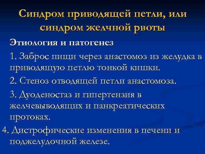 Синдром приводящей петли, или синдром желчной рвоты Этиология и патогенез 1. Заброс пищи через анастомоз из желудка в приводящую петлю тонкой кишки. 2. Стеноз отводящей петли анастомоза. 3. Дуоденостаз и гипертензия в желчевыводящих и панкреатических протоках. 4. Дистрофические изменения в печени и поджелудочной железе.