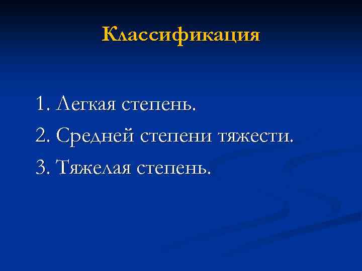 Классификация n 1. Легкая степень. n 2. Средняя степень тяжести. n 3. Тяжелая степень.