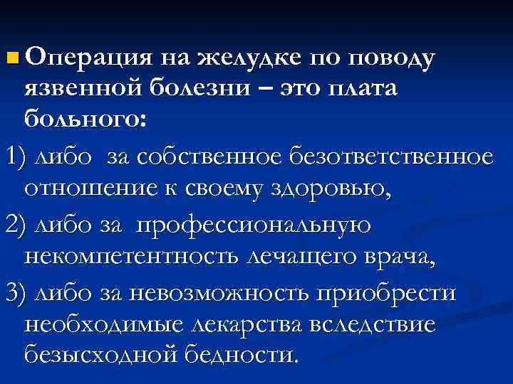 n Операция на желудке по поводу язвенной болезни – это плата больного: 1) либо за собственное безответственное отношение к своему здоровью, 2) либо за профессиональную некомпетентность лечащего врача, 3) либо за невозможность приобрести необходимые лекарства вследствие безысходной бедности.