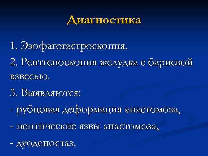Диагностика 1. Эзофагогастроскопия. 2. Рентгеноскопия желудка с бариевой взвесью. 3. Выявляются: - рубцовая деформация анастомоза, - пептические язвы анастомоза, - дуоденостаз.