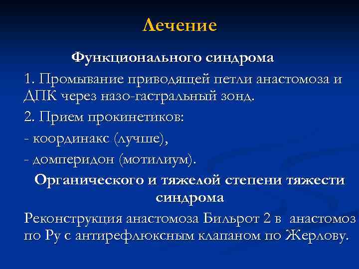 Лечение Функционального синдрома 1. Промывание приводящей петли анастомоза и ДПК через назо-гастральный зонд. 2. Прием прокинетиков: - координакс (лучше), - домперидон (мотилиум). Органического и тяжелой степени тяжести синдрома Реконструкция анастомоза Бильрот 2 в анастомоз по Ру с антирефлюксным клапаном по Жерлову.