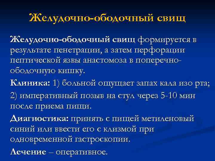 Желудочно-ободочный свищ формируется в результате пенетрации, а затем перфорации пептической язвы анастомоза в поперечноободочную кишку. Клиника: 1) больной ощущает запах кала изо рта; 2) императивный позыв на стул через 5 -10 мин после приема пищи. Диагностика: принять с пищей метиленовый синий или ввести его с клизмой при одновременной гастроскопии. Лечение – оперативное.