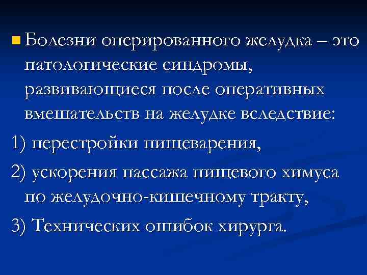 n Болезни оперированного желудка – это патологические синдромы, развивающиеся после оперативных вмешательств на желудке вследствие: 1) перестройки пищеварения, 2) ускорения пассажа пищевого химуса по желудочно-кишечному тракту, 3) Технических ошибок хирурга.