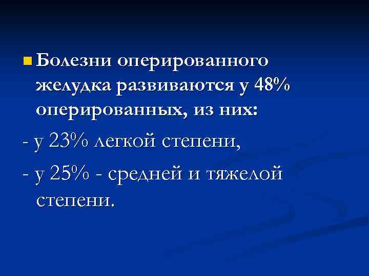 n Болезни оперированного желудка развиваются у 48% оперированных, из них: - у 23% легкой степени, - у 25% - средней и тяжелой степени.