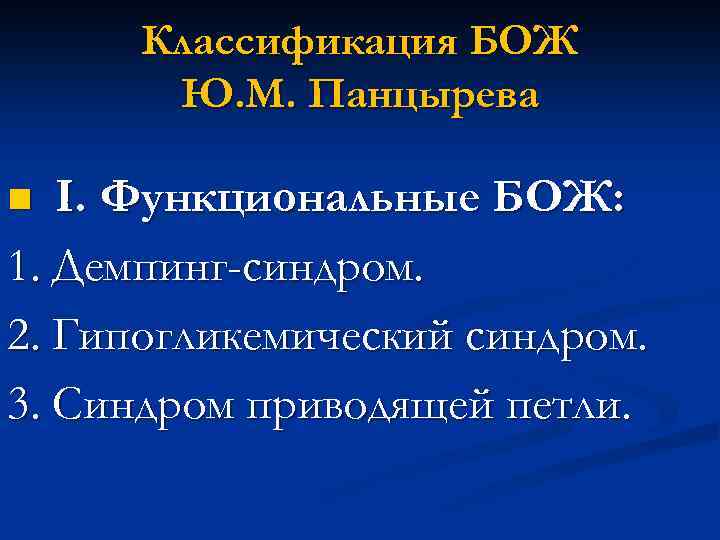 Классификация БОЖ Ю. М. Панцырева I. Функциональные БОЖ: 1. Демпинг-синдром. 2. Гипогликемический синдром. 3. Синдром приводящей петли. n