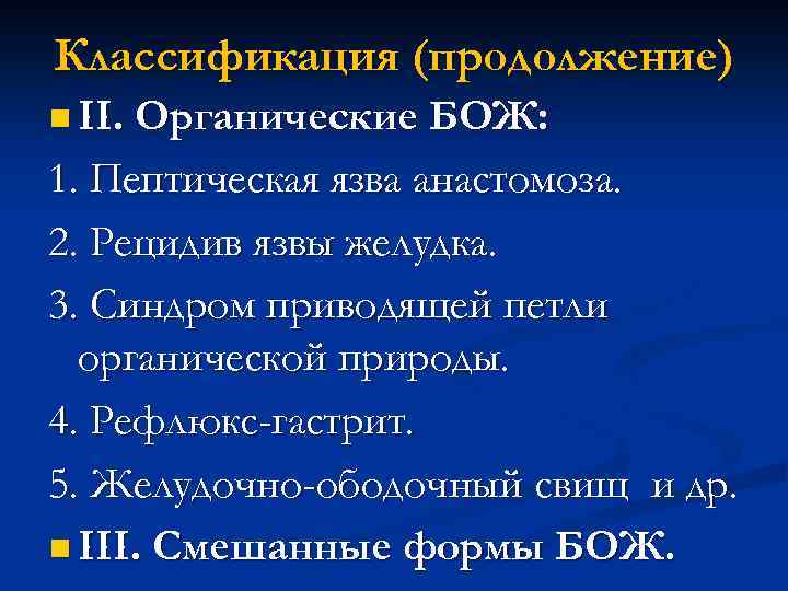 Классификация (продолжение) n II. Органические БОЖ: 1. Пептическая язва анастомоза. 2. Рецидив язвы желудка. 3. Синдром приводящей петли органической природы. 4. Рефлюкс-гастрит. 5. Желудочно-ободочный свищ и др. n III. Смешанные формы БОЖ.