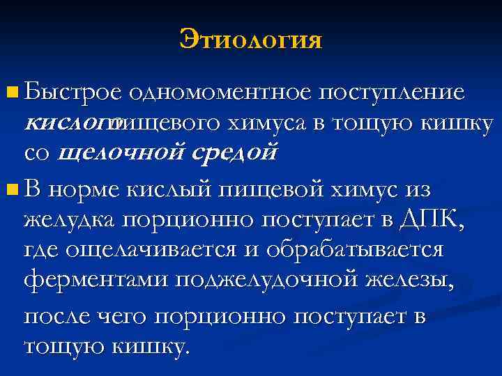 Этиология n Быстрое одномоментное поступление кислого пищевого химуса в тощую кишку со щелочной средой. n В норме кислый пищевой химус из желудка порционно поступает в ДПК, где ощелачивается и обрабатывается ферментами поджелудочной железы, после чего порционно поступает в тощую кишку.