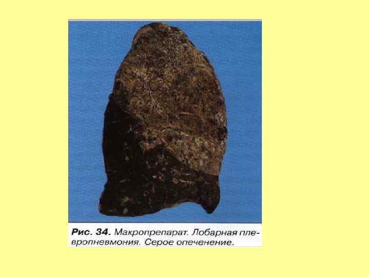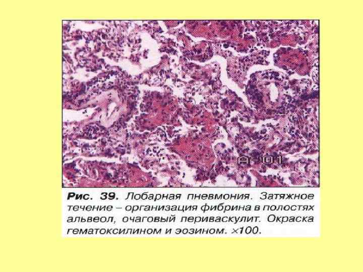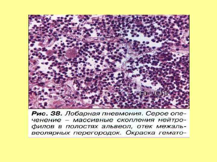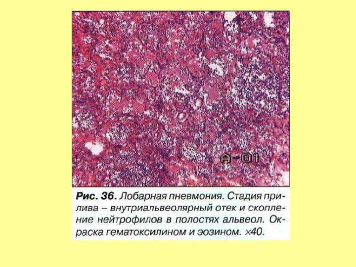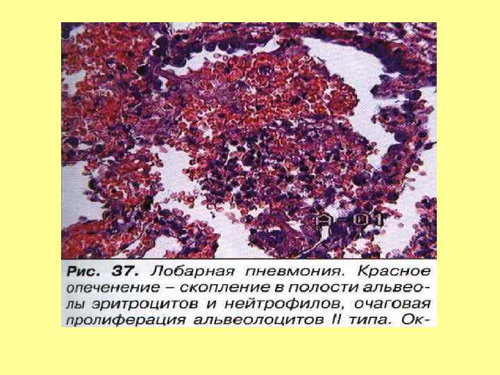 • Морфогенез, патологическая анатомия. Долевая пневмония является классическим примером острого воспаления и состоит из четырех стадий: • 1. Стадия прилива. Первая стадия длится 24 часа и характеризуется заполнением альвеол богатым белками экссудатом и венозным застоем в легких. Легкие становятся плотными, тяжелыми, отечными и красными. • 2. Стадия красного опеченения. На второй стадии, которая длится несколько дней, наблюдается массивное накопление в просвете альвеол полиморфноядерных лейкоцитов с небольшим количеством лимфоцитов и макрофагов, между клетками выпадают нити фибрина. Также в экссудате содержится большое количество эритроцитов. Часто плевра над очагом поражения покрывается фибринозным экссудатом. Легкие становятся красными, плотными и безвоздушными, напоминая по консистенции печень. • 3. Стадия серого опеченения. Эта стадия также может длиться несколько дней и характекризуется накоплением фибрина и разрушением белых и красных клеток крови в экссудате. Легкие на разрезе становятся серокоричневыми и плотными. • 4. Стадия разрешения. Четвертая стадия начинается на 8 -10 сутки заболевания и характеризуется резорбцией экссудата, ферметным расщеплением воспалительного детрита и восстановлением целостности стенок альвеол. Фибринозный экссудат под влиянием протеолитических ферментов нейтрофилов и макрофагов подвергается расплавлению и рассасыванию. Происходит очищение легкого от фибрина и микроорганизмов: экссудат элиминируется по лимфатическим дренажам легкого и с мокротой. Фибринозные наложения на плевре рассасываются. Стадия разрешения растягивается иногда на несколько дней после клинически безлихорадочного течения болезни.