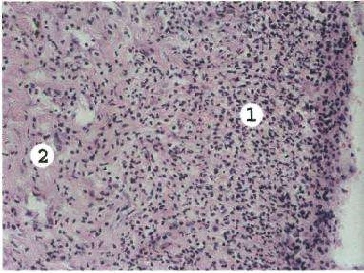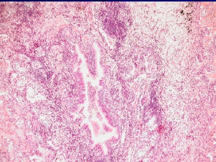 Основные микроскопические особенности острой межуточной пневмонии: воспалительный инфильтрат в межуточной ткани легкого, чаще продуктивный характер воспаления, возможно вторичное образование экссудата в просвете альвеол, в исходе пневмонии возможен фиброз.