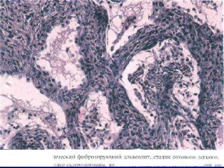 Стадии ИБЛ Альвеолит (диффузный или гранулематозный) Дезорганизация альвеолярных структур с фиброзом Формирование сотового легкого