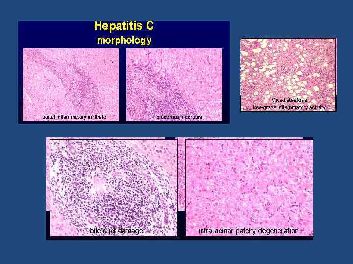 ВИРУСНЫЕ ГЕПАТИТЫ ( А, B, C, D, E, G) МОРФОЛОГИЯ Микро: - гидропическая и балонная дистрофия гепатоцитов - некроз отдельных клеток или групп клеток - тельца Каунсильмена ( апоптоз) - инфильтрация портальной и дольковой стромы Лф, Мф с НЛ ( мало) - пролиферация звездчатых ретикулоцитов - холестаз - регенерация гепатоцитов