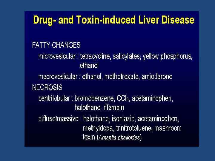 • ГЕПАТОЗЫ - группа заболеваний, в основе которых лежат дистрофия и некроз гепатоцитов. • • - Наследственные - Приобретенные : острый массивный прогрессирующий некроз печени ( токсическая дистрофия печени) хронический Жировой гепатоз