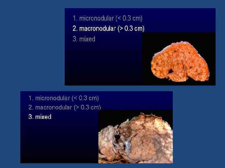 2. По морфологии: А) макро: крупноузловой, мелкоузловой, смешанный Б) микро: монолобулярный, мультилобулярный мелкоузловой