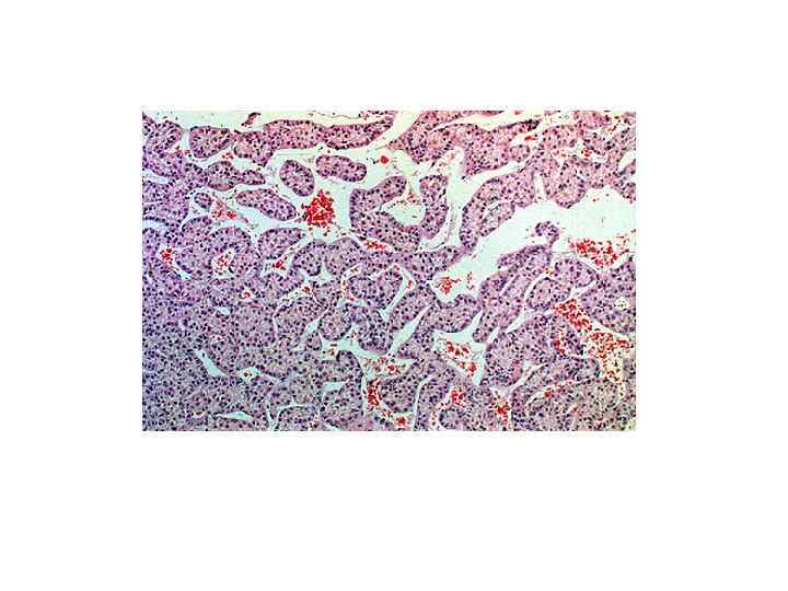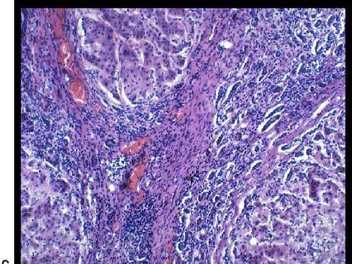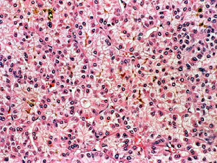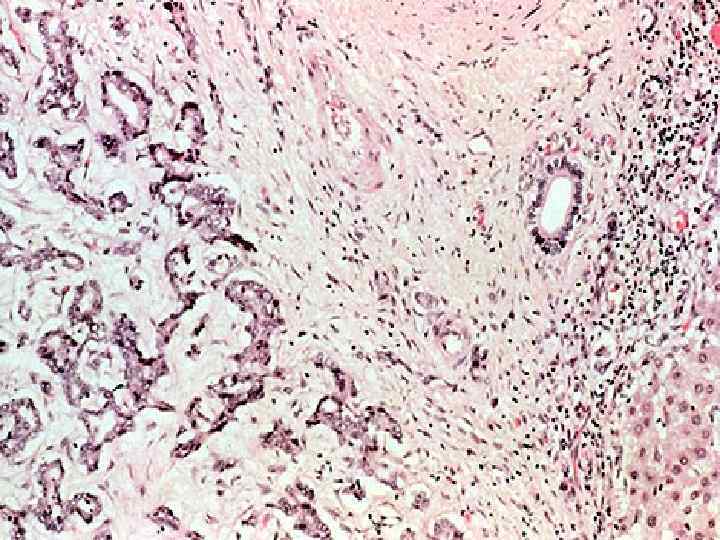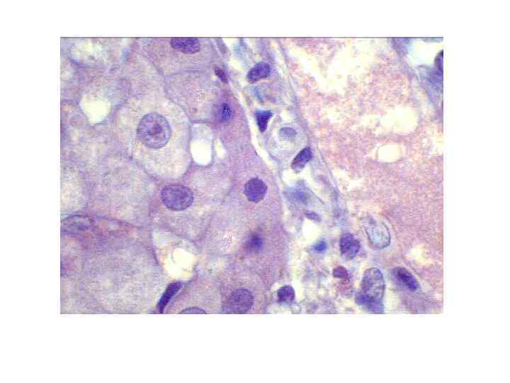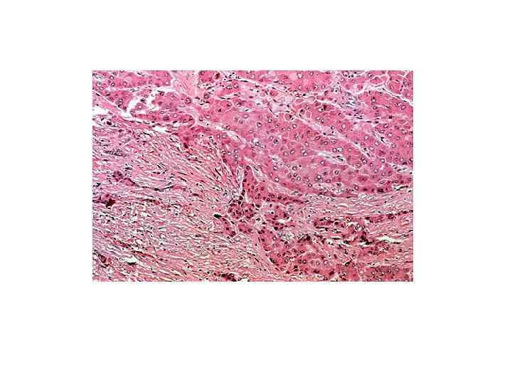 Злокачественные опухоли печени • МИКРО-крупные эозинофильные опухолевые клетки, которые складываются в трабекулы (гепатоцеллюлярный рак) -структуры аденокарциномы разной степени зрелости (холангиоцеллюлярный) -опухолевые клетки, напоминающие эмбриональные и фетальные (гепатобластома)