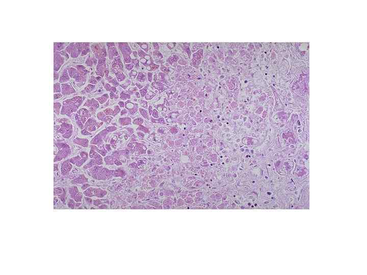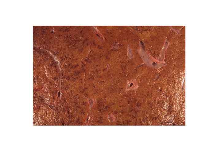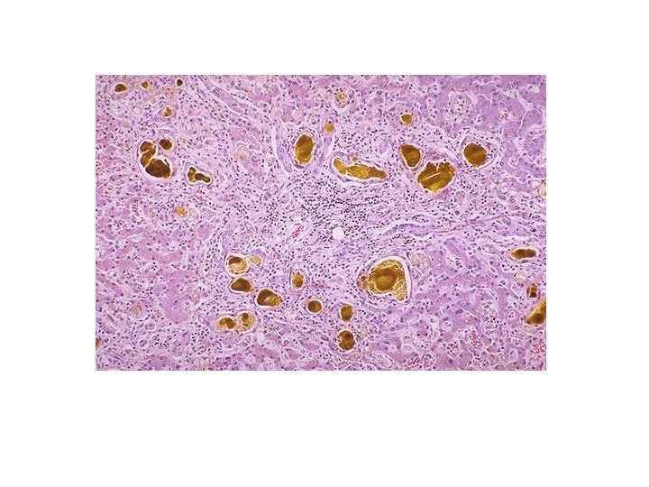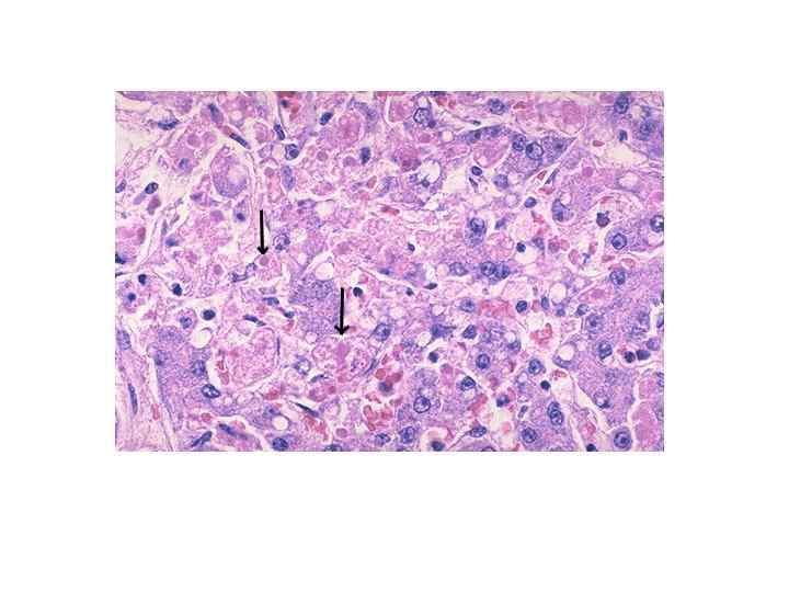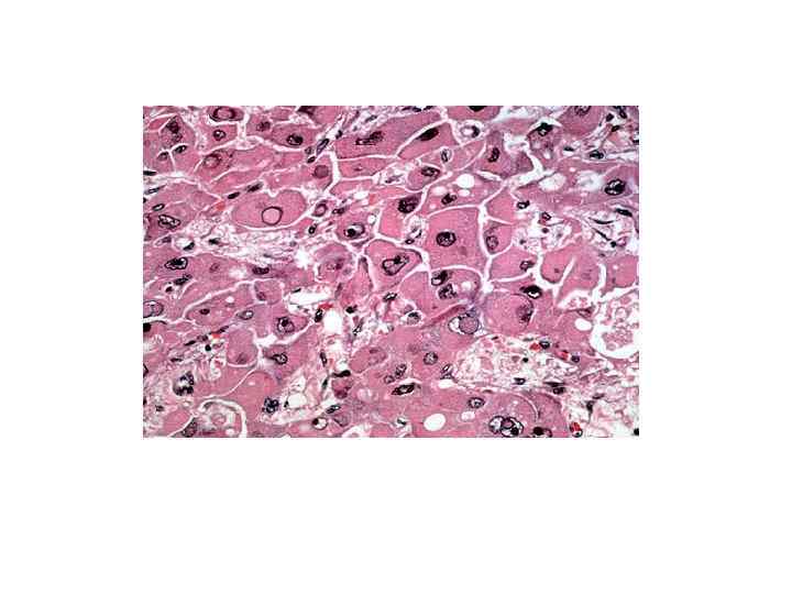 Некроз • моноцеллюлярный (тельца Каунсильмена)-гепатоциты уменьшены в объеме с пикнотизированными ядрами • зональный-чаще в 3 зоне, так как интенсивнее обмен ксенобиотиков • ступенчатый (перипортальный и перисептальный) -некроз гепатоцитов пограничной пластинки • мостовидный (порто-портальный и порто-центральный)некроз гепатоцитов в виде мостиков • мультилобулярный- распространенный обширный некроз • Некрозы, как правило, маскируются воспалительным инфильтратом