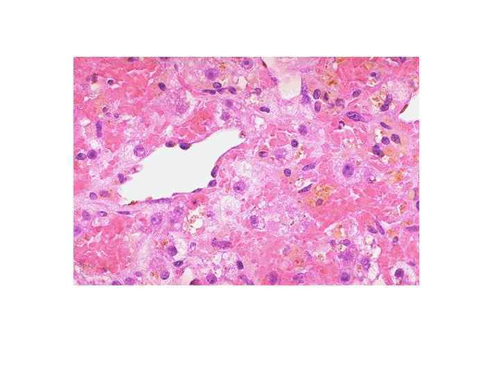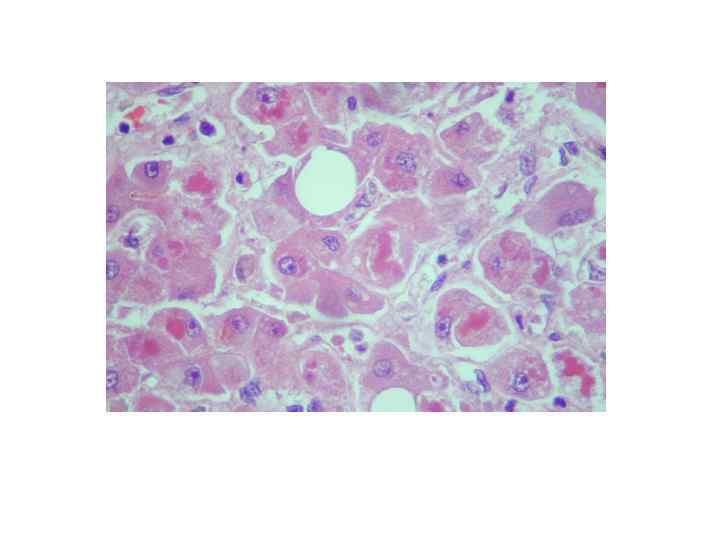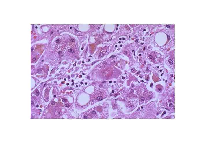 Алкогольная болезнь печени (морфология) • -микровезикулярная жировая дистрофия (менее благоприятна) • -макровезикулярная жировая дистрофия • -очаговые интралобулярные некрозы с преимущественно нейтрофильной инфильтрацией • -алкогольный гиалин (тельца Маллори)