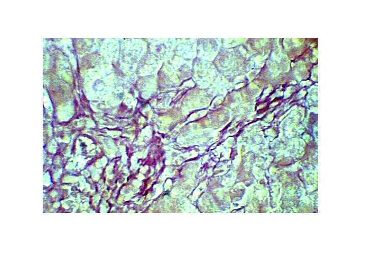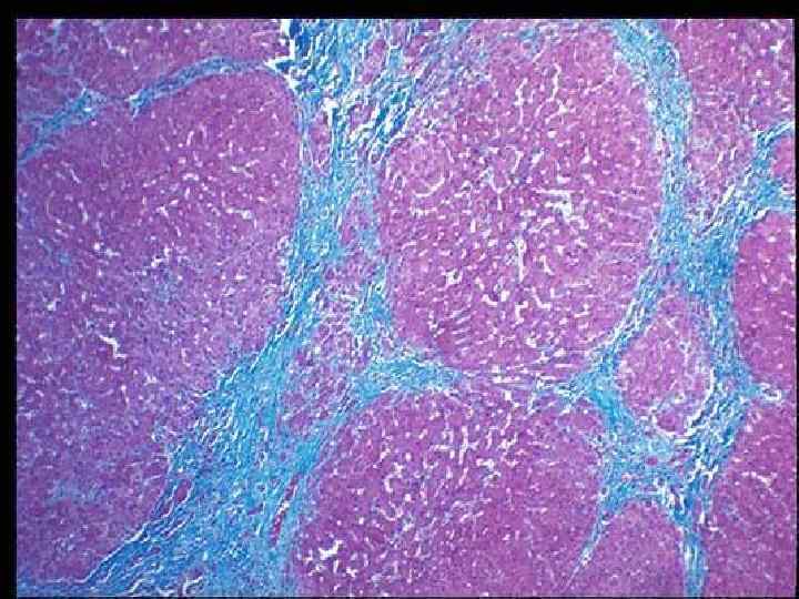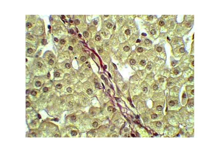 Фиброз • -перигепатоцеллюлярный-увеличение коллагеновых волокон на синусоидальной поверхности гепатоцита • Формирование базальной мембраны и перицеллюлярный фиброз затрудняют обмен между гепатоцитами и кровью. Гепатоциты подвергаются атрофии, развивается диффузный фиброз