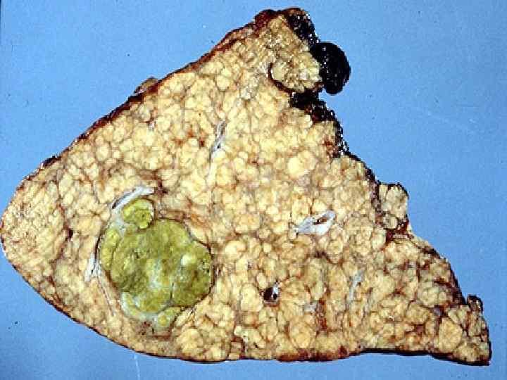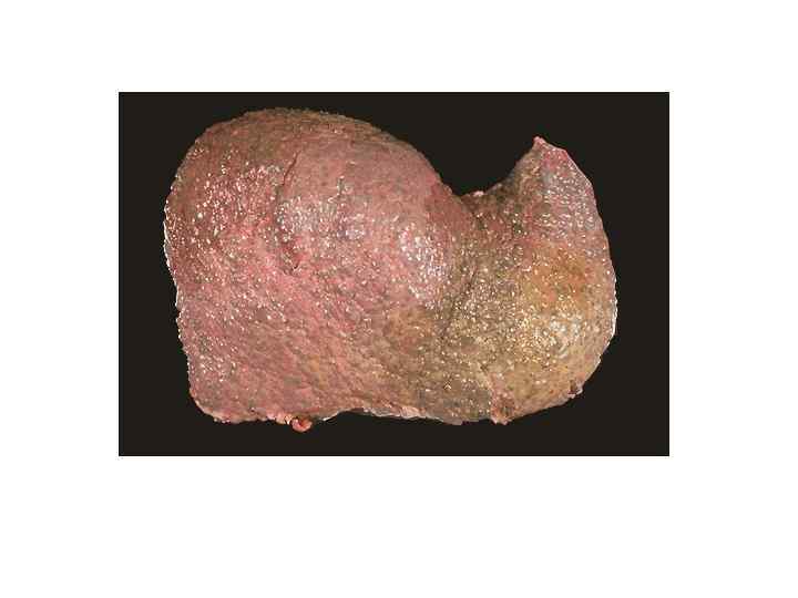 Цирроз печени • -диффузный процесс, который характеризуется избыточным развитием фиброзной ткани и образованием регенераторных узлов с нарушением архитектоники печени и развитием внутрипеченочных сосудистых анастомозов. • МАКРОскопически выделяют: • -микронодулярный (узлы 1 -3 мм) • -макронодулярный (более 3 мм) • -смешанный