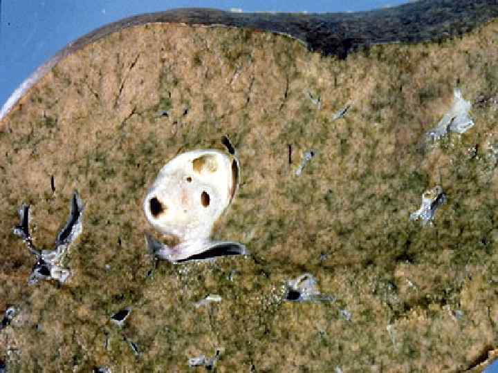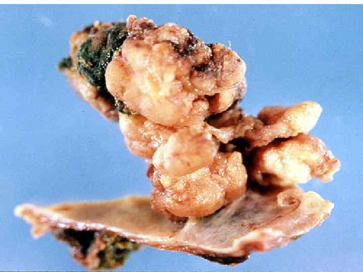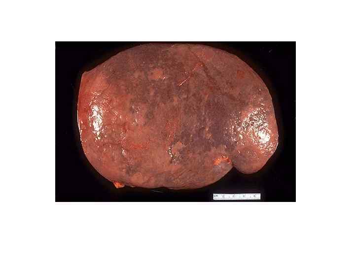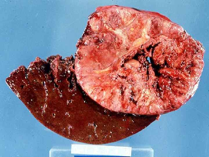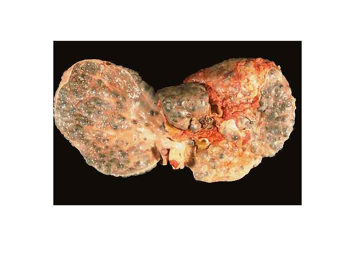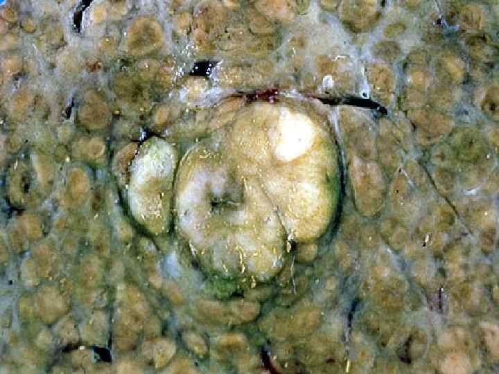 Злокачественные опухоли печени • МАКРО- три формы -узловая -диффузная -массивная Ткань серого цвета, зеленовато-серого цвета, плотной консистенции с очагами кровоизлияний и зонами распада