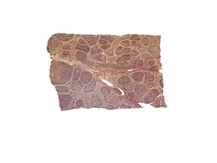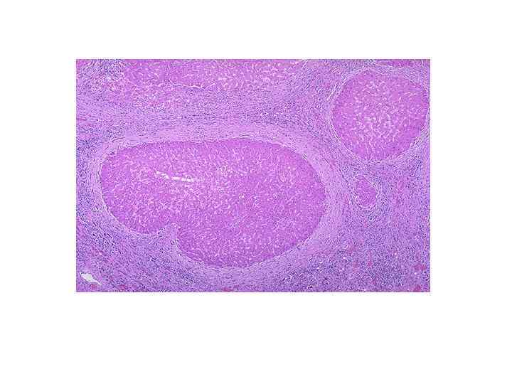 ЦИРРОЗ ПЕЧЕНИ МИКРО • -МОНОЛОБУЛЯРНЫЙ- узелок образуется на территории одной дольки, в узле отсутствуют портальный тракты и центральные вены • -МУЛЬТИЛОБУЛЯРНЫЙ- узелки образованы несколькими дольками, портальные тракты и центральные вены есть