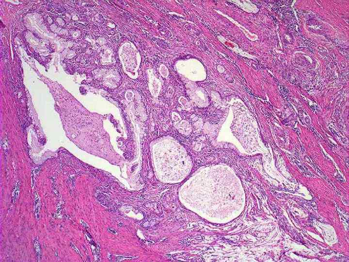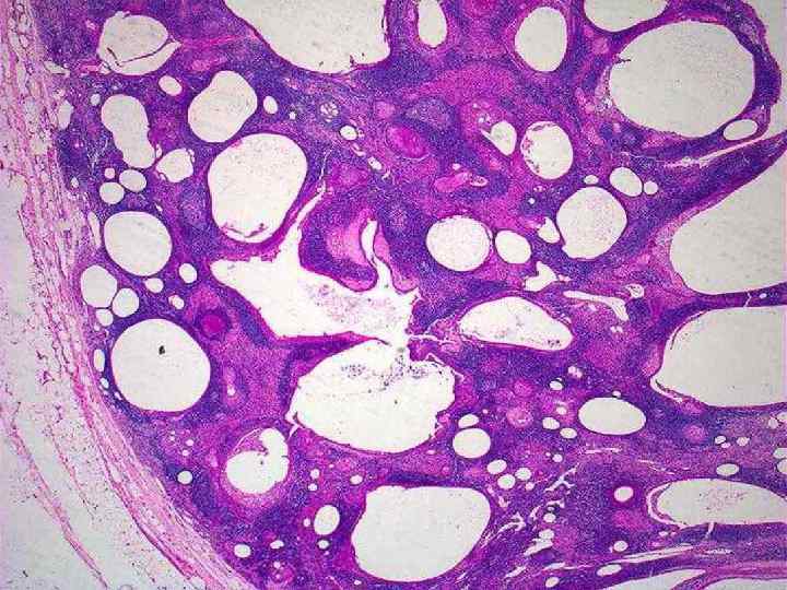 Опухоль Уортона Макро- Микро- • Бледно-серый узел • На разрезе множество мелких кист с серозным содержимым • Железистые и кистозные структуры выстланы двойным слоем клеток • В строме имеется лимфойдная ткань