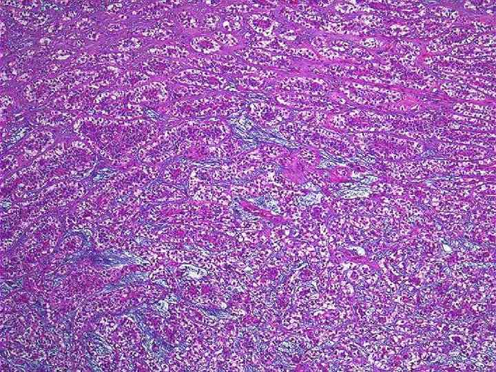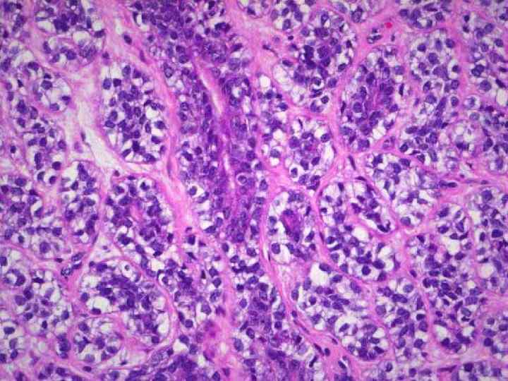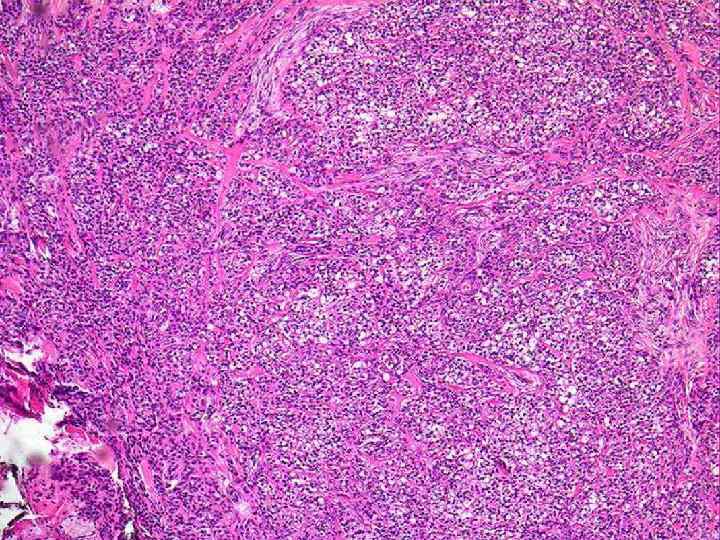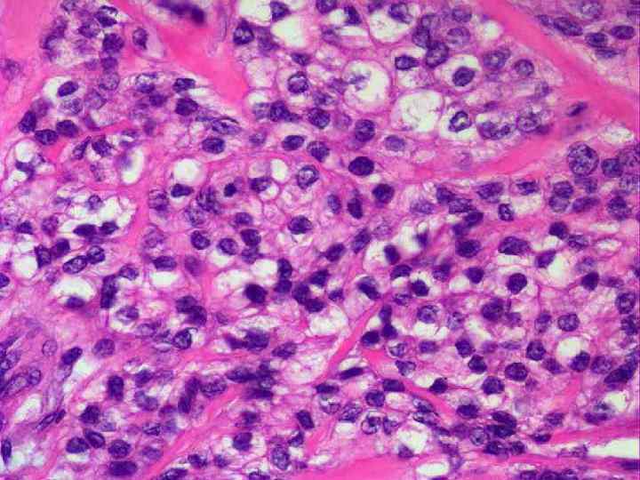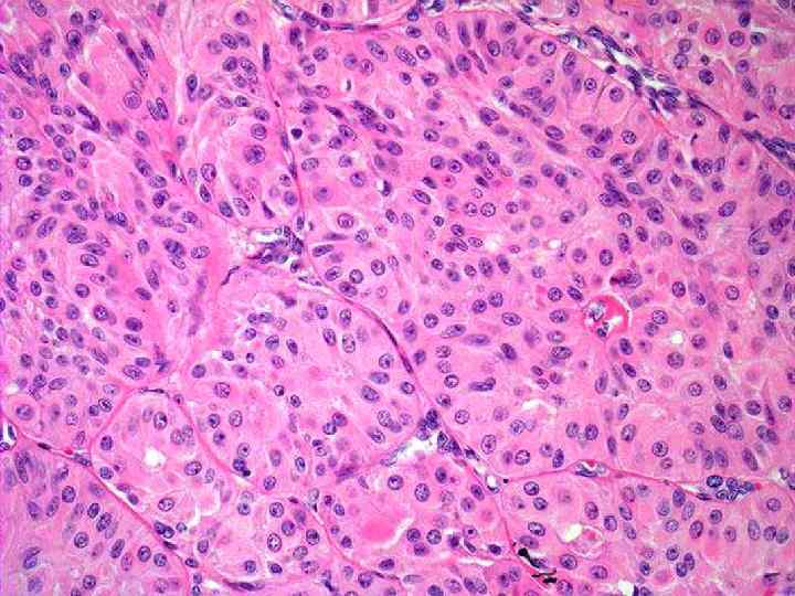 Ациноклеточная карцинома Макро- Микро- • Плотный серый узел до 1 см в диаметре • Имеется капсула • Светлые зернистые клетки • Напоминают серозные клетки ацинусов • Солидный тип • Микрокистозный тип • Гиалиноз стромы