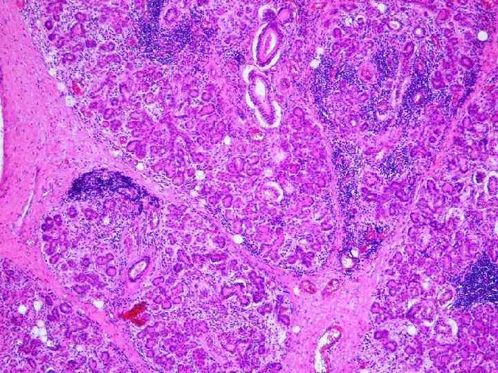 Патологическая анатомия Макро- Микро- • Увеличение, уплотнение желез • Тяжелая дистрофия эпителия ацинусов и протоков • Очаговая лимфогистиоцитарная инфильтрация (CD 4+, CD 20+)