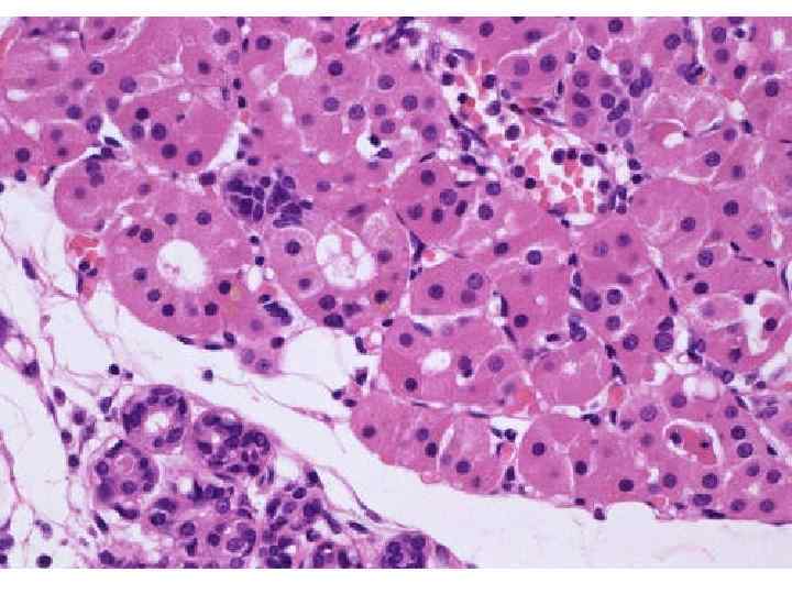 Онкоцитоз • Эозинофильная зернистость в цитоплазме ацинарных клеток – онкоциты • Этиология не ясна • Усиленный обмен биогенных аминов • Возможное извращенное проявление патологической регенерации