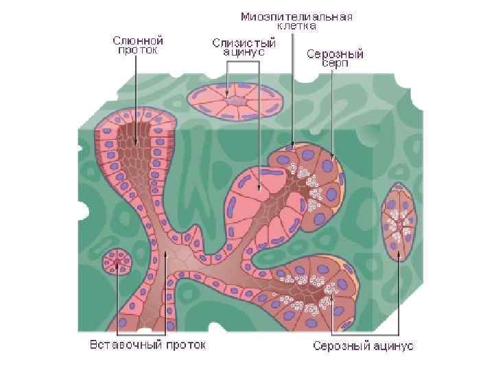 Слюнные железы • Ацинус – ацинарные и миоэпителиальные клетки • Вставочный проток – эпителиальные, миоэпителиальные и резервные клетки • Исчерченный проток – эпителиальные клетки и онкоциты • Междольковый проток – эпителиальные клетки выводных протоков