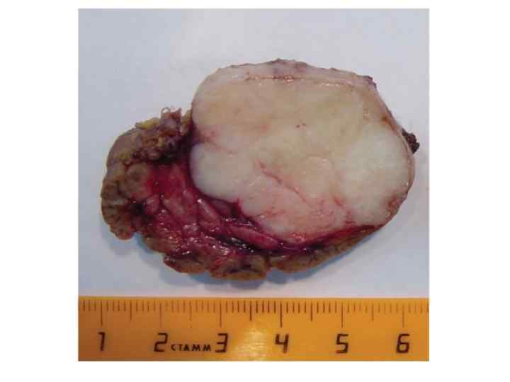 Онкоцитома Макро- Микро- • Узел с четкими границами • Эластической консиситенции • Окружен капсулой • На разрезе бурого цвета • Крупные светлые клетки с зернистой цитоплазмой и небольшим ядром • Формирование альвеолярно-солидных структур