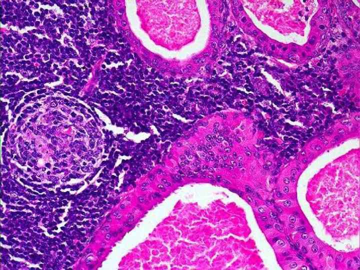 Патологическая анатомия Макро- Микро- • Плотные инфильтраты в слюнных железах • Тяжелая дистрофия эпителия ацинусов и протоков • Серозно-фибринозное воспаление в интерстиции • Лимфогистиоцитарная инфильтрация • Гиперплазия лимфойдных фолликулов