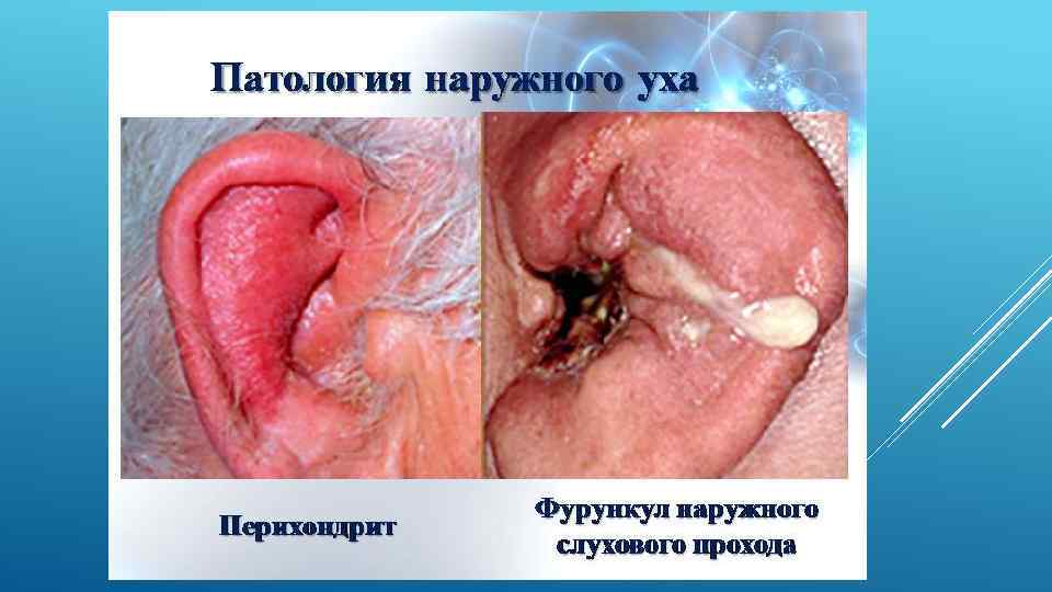 Перихондрит ушной раковины возникает в резулитате проникновения инфекции. Сильные боли в ухе отмечаются еще до появления изменений на ушной раковине, затем становится заметным покраснение и припухание всей раковины, за исключением мочки, повышается температура тела. Лечение проводится общее и местное противовасполительное(а/б, согревающие полуспиртовые компрессы, УВЧ терапия), при появлении признаков нагноения производят разрез паралельно контурам ушной раковины с выскабливанием полости абсцесса и удалением всех некротических участков хряща.