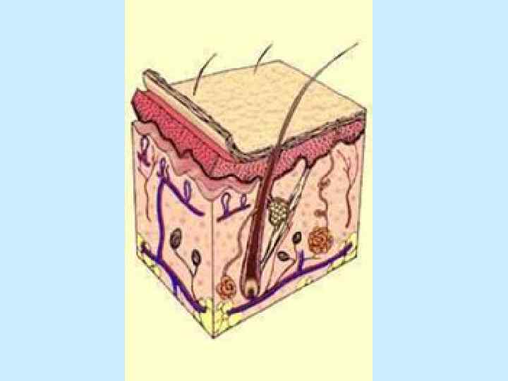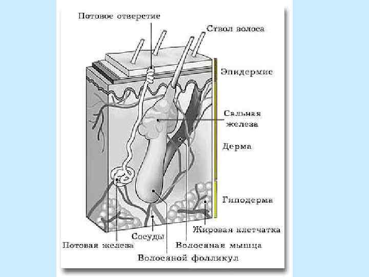 • способность выводить некоторые лекарственные вещества (ртуть, мышьяк) • распространение запаха пота апокриновых и сальных желез, парфюма • волосяные фолликулы являются источником регенерации поврежденного эпидермиса • рецепторная функция • механическая защита и защита от УФО