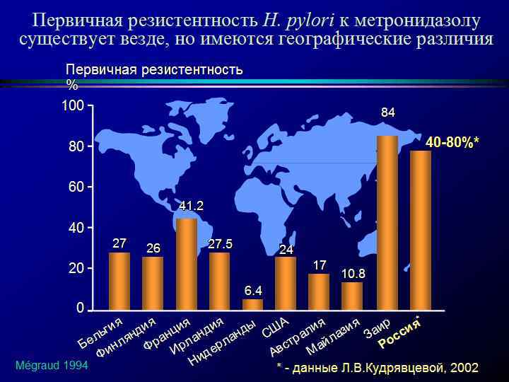 Лечение HР -ассоциированных заболеваний. • Метронидозол, который раньше являлся антибиотиком выбора сейчас не применяется, поскольку резистентность к препарату растет и уже для некоторых штаммов НР достигла 80% ! • Кларитромицин при необходимости можно заменить тетрациклином (250 мг х 4 р/д) или фуразолидоном • Только при неэффективности тройной терапии прибегают к 4 -х компонентной схеме, включающей в себя ИПП + 2 антибиотика + • коллоидный субстрат висмута (Де-нол) 120 мг х 4 р/д.